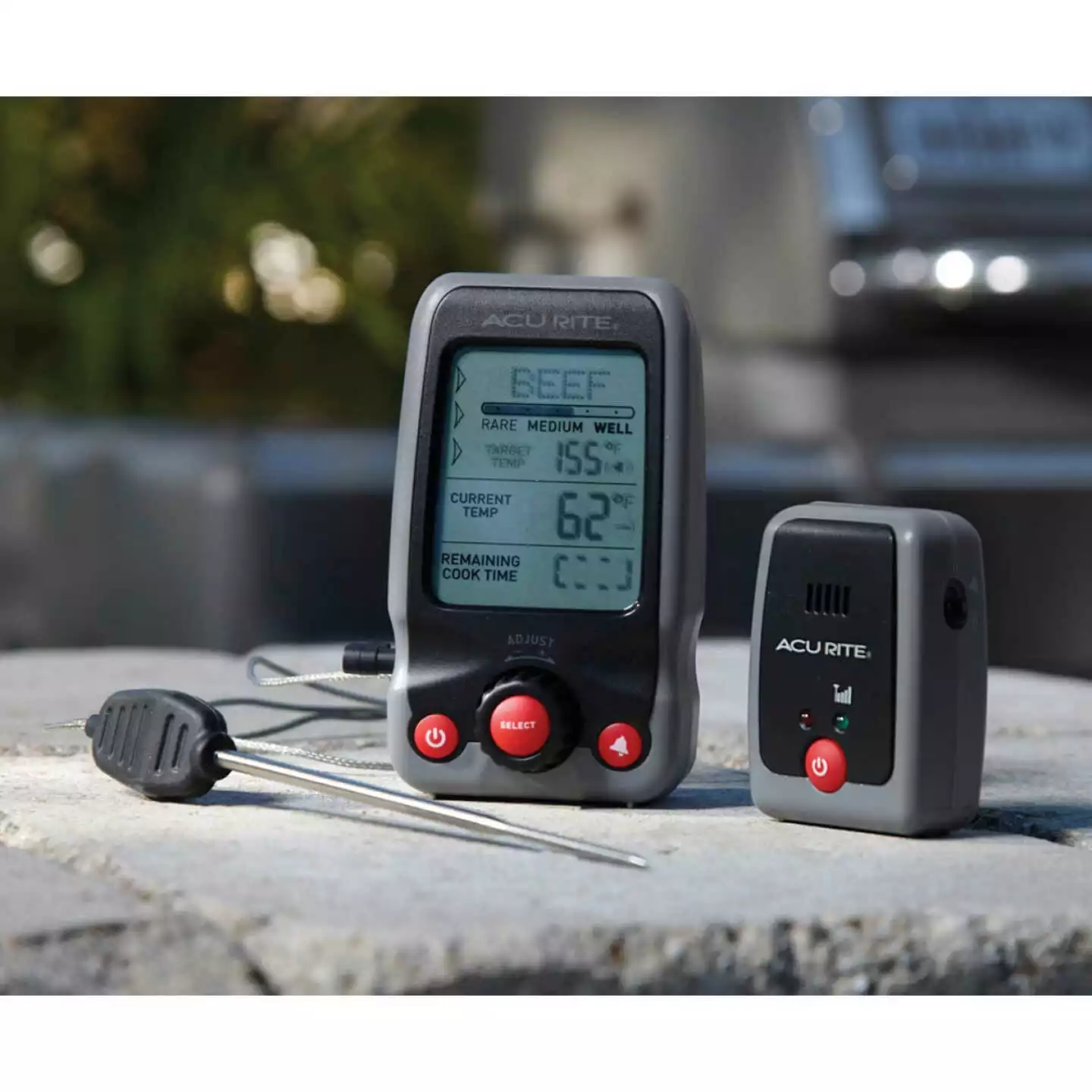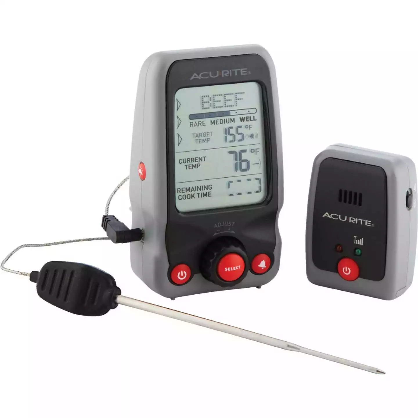 Commercial quality stainless steel probe measures internal food temperature while roasting and features a 3 Ft., 700 F ( Fahrenheit) heat resistant cord, perfect for monitoring food in the oven, grill, fryer, or smoker. Select one of the USDA recommended temperature presets or set the temperature and time with an easy-set rotary dial. Patent-pending technology estimates time left to cook. Remote pager alerts with sound, light, and vibration within a 200 Ft. wireless range when desired temperature is reached. Includes: digital meat thermometer, 3 ft. cord and probe, wireless pager and instruction manual. 1 year limited warranty.