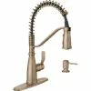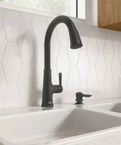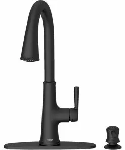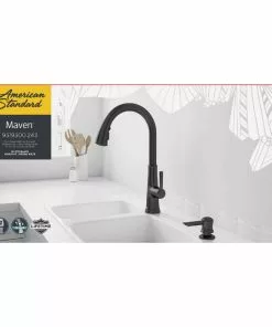 The Maven Kitchen Faucet with Pull-Down spray head from American Standard combines beauty and dependability in a sleek, contemporary design. Dual-function spray head features a toggle control to easily switch from regular stream for filling pots to spray for rinsing vegetables and cleaning the sink. A handy pause button stops water flow momentarily. Equipped with Re-Trax to ensure smooth extension and retraction of the spray head, the Maven faucet is an exceptional value that includes matching soap dispenser and optional deck plate. Includes flexible braided 35″ supply hoses with 3/8″ compression connections