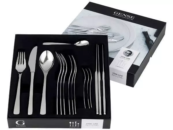 Med en kombination af elegant formgivning og behagelige linjer passer Steel Line perfekt ind i de fleste indretninger og borddækninger. Steel Line er skabt af Henning Seidelin, en af Danmarks bedste billedhuggere.Tåler opvaskemaskine.Sættet består af 16 d