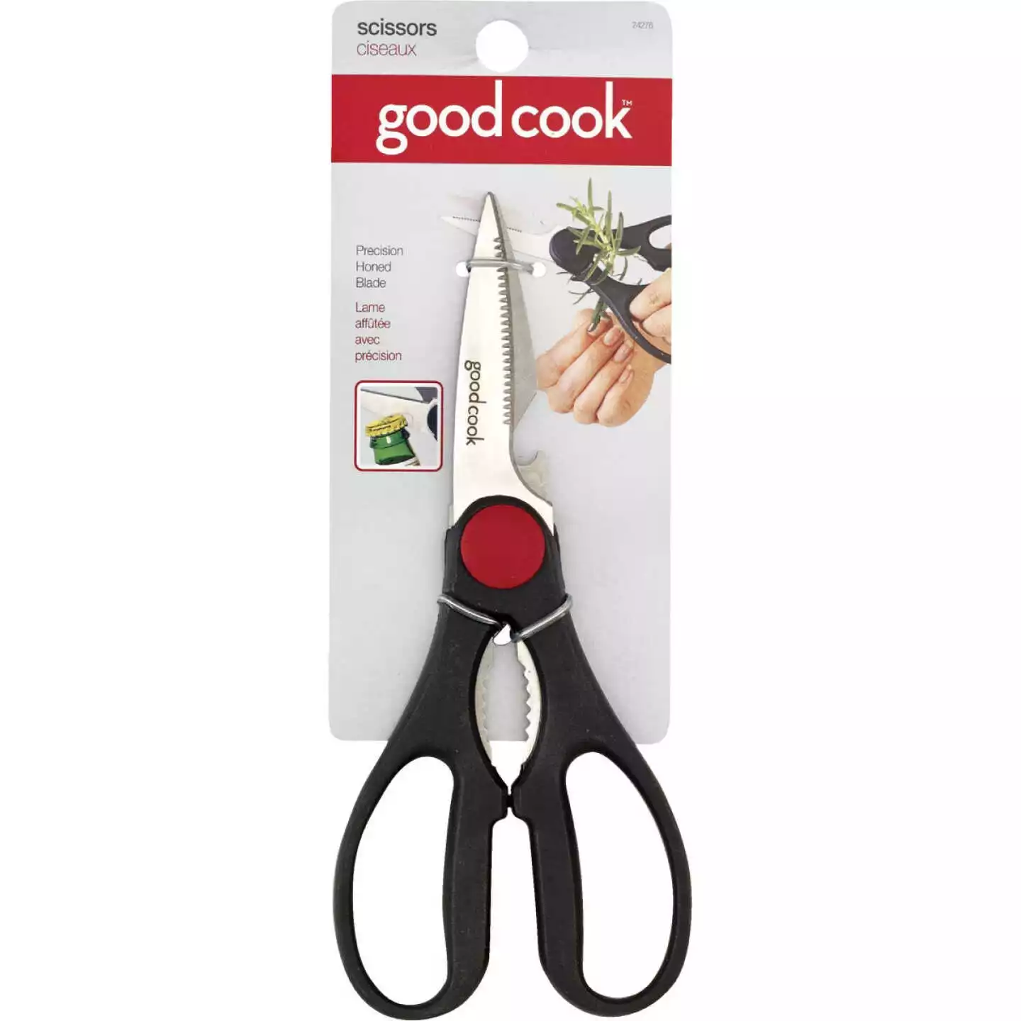 Gourmet Stainless Steel Shears for chopping herbs, cutting pizza, prepping vegetables and more. Precision honed blades are designed to stay sharp. Pointed tips are great for poking holes into microwave dinners that need ventilation. Plastic laminate handle. Dishwasher safe.