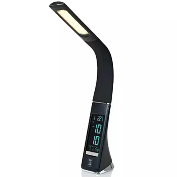 Fleksibel bordlampe med indbygget ur/vækkeur. Den er særligt velegnet som natbordslampe, da den både har indbygget lys og vækkeur. Udover visning af klokkeslæt, viser den dato og temperatur. Den har en højde på 33 cm og en diameter på Ø4,5 cm. Der er indb