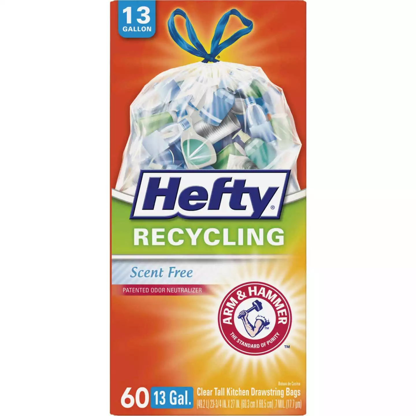 Hefty 13 Gal. clear tall kitchen recycling bags are designed to handle all types or recyclables. Developed for use in municipal recycling programs where applicable. Transparent for quick sorting and curbside identification. Arm & Hammer patented odor neutralizer.