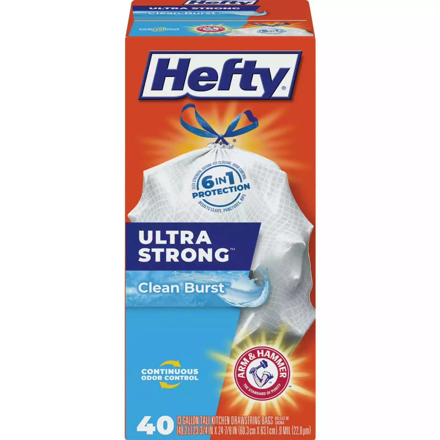 Ultra Strong has active tear-resistant technology, higher grade resin, Arm & Hammer patented odor neutralizer, and improved secure-grip drawstring. 13 Gal. capacity. White.