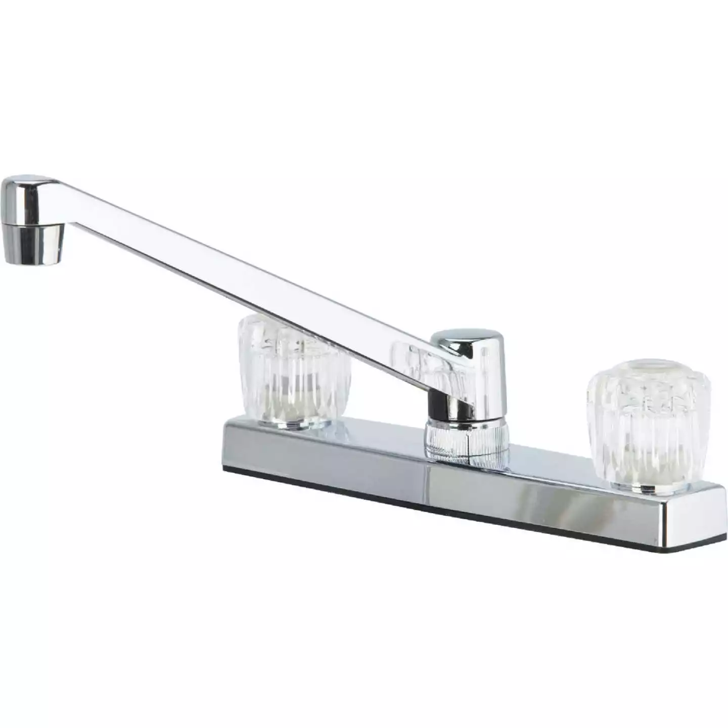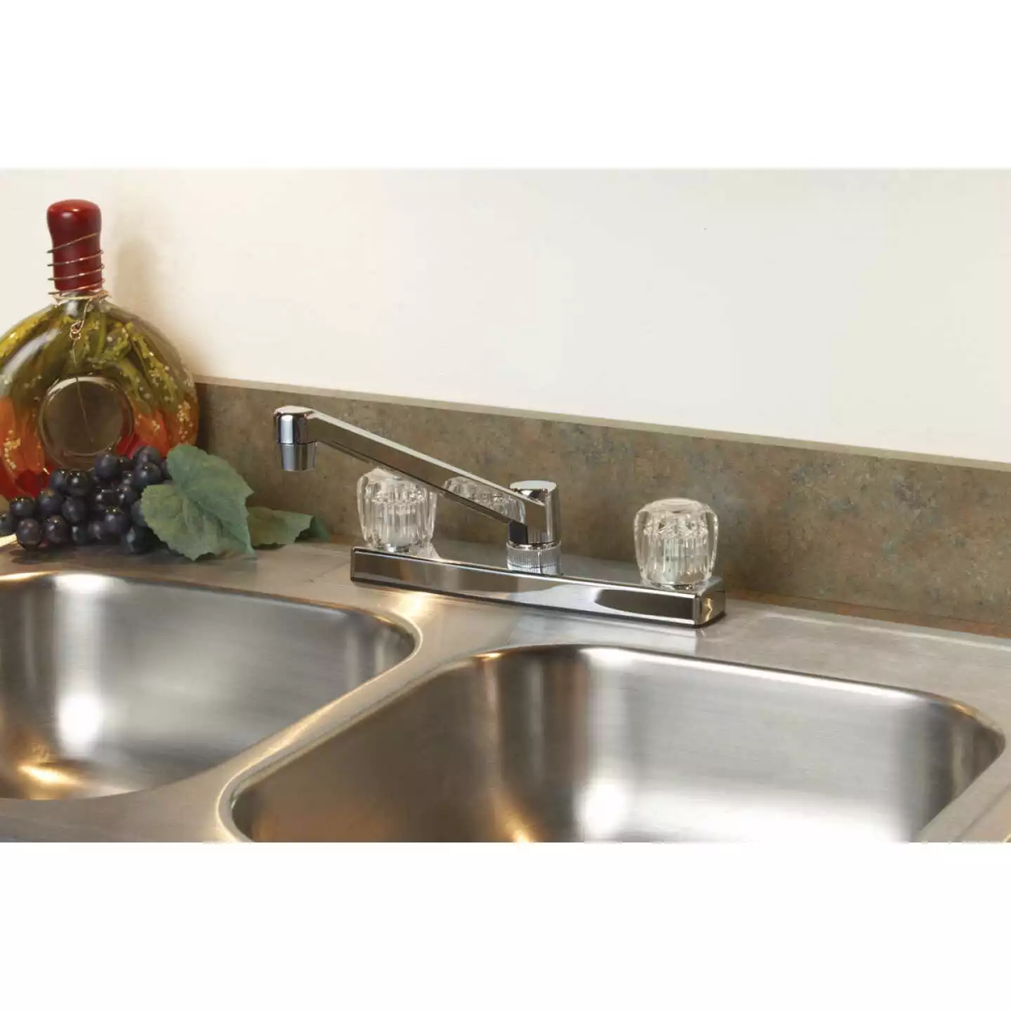 2-handle nonmetallic kitchen faucet with clear acrylic knobs. 1.8 GPM (gallons per minute) maximum at 60 psi (pounds per square inch). Plastic construction, washerless cartridge. 8″ centerset, 1/2″ IPS (iron pipe size) connectors. Chrome finish. Meets CUPC (Uniform Plumbing Code Canadian) certification, NSF (National Sanitation Foundation)/ANSI (American National Standards Institute) 371, and NSF/ANSI 61-9 standards. 5 year warranty.