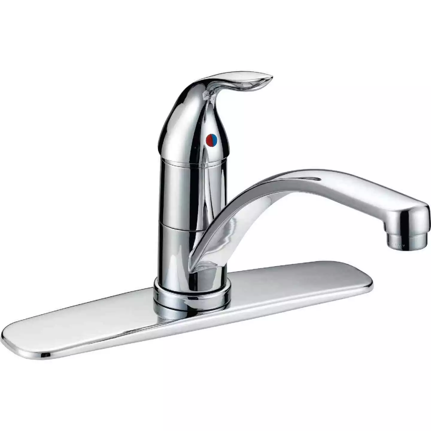 Home Impressions single handle kitchen faucet. Comes with optional deck plate. 1 or 3 hole mount. Finish: Polished chrome. Number of handles: 1 handle. Side Sprayer: No. Pull-out sprayer: No. Flow Rate: 1.8 GPM (gallons per minute) at 60 psi (pounds per square inch). Spout Length 9″, mounting holes 6″. For replacement cartridge see Model No. A507348N-JPF1 (SKU 428515).
