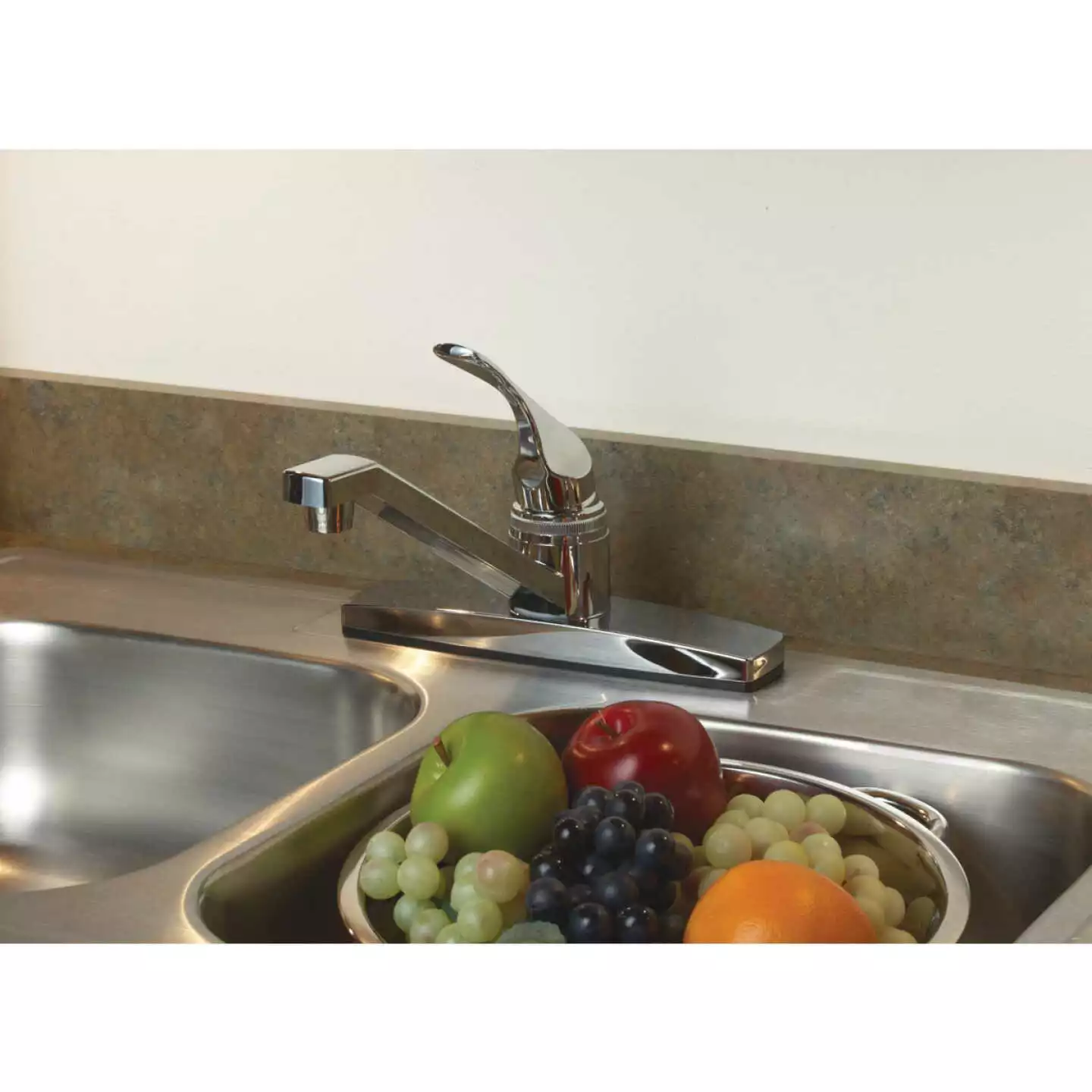 SIngle handle nonmetallic kitchen faucet with metal lever handle. 1.8 GPM (gallons per minute) maximum at 60 psi (pounds per square inch). 8″ centerset, 1/2″ IPS (iron pipe size) connectors. ADA (Americans with Disabilities Act) certified. Chrome finish. Meets cUPC (Uniform Plumbing Code Canadian) certification, NSF (National Sanitation Foundation)/ANSI (American National Standards Institute) 371, and NSF/ANSI 61-9 standards. 5 year warranty.