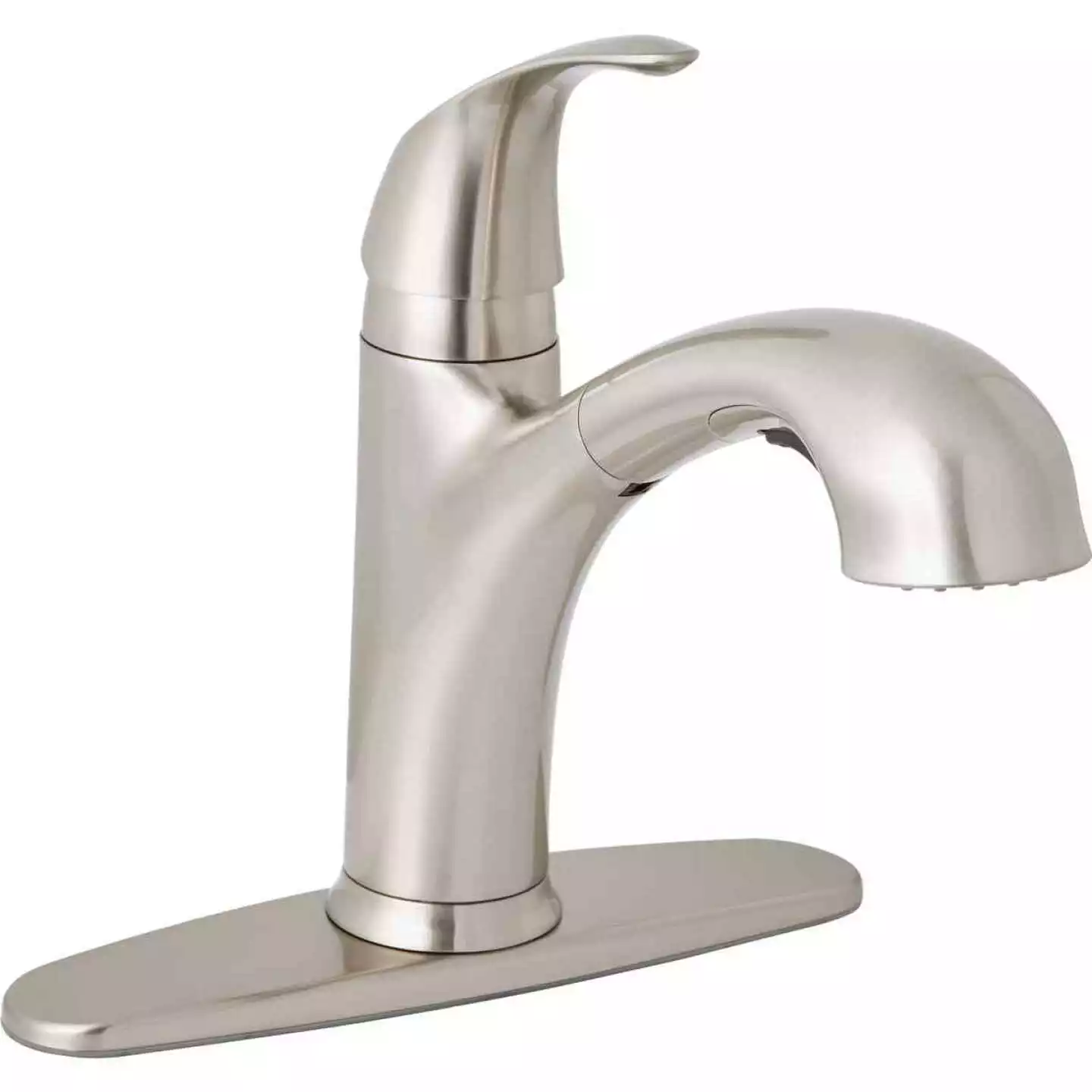 Single-handle kitchen faucet with dual function pullout sprayer. 1- or 3-hole installation with optional deckplate included. Low lead brass body with ceramic disc cartridge. 1.8 GPM (gallons per minute) maximum at 60 psi (pounds per square inch) water flow rate. ADA (Americans with Disabilities Act) compliant.