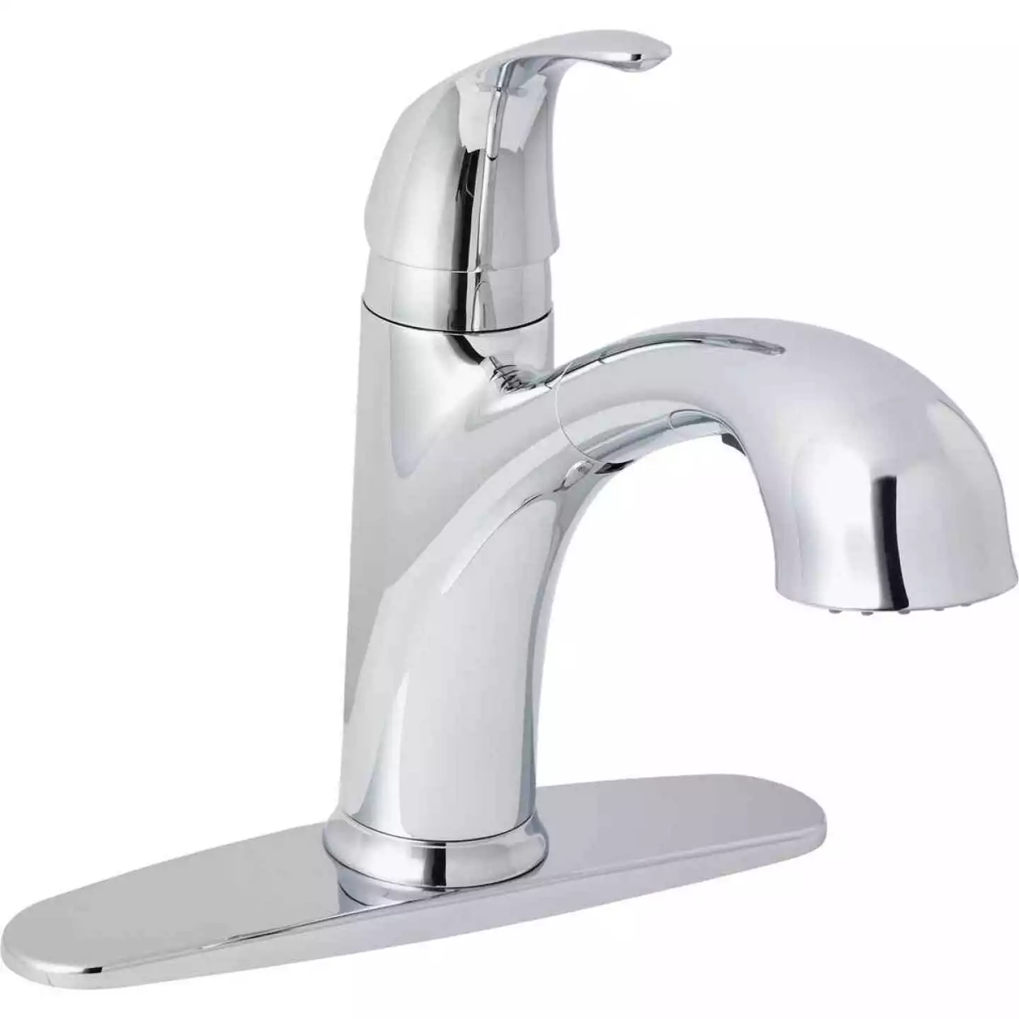 Single-handle kitchen faucet with dual function pullout sprayer. 1- or 3-hole installation with optional deckplate included. Low lead brass body with ceramic disc cartridge. 1.8 GPM (gallons per minute) maximum at 60 psi (pounds per square inch) water flow rate. ADA (Americans with Disabilities Act) compliant.