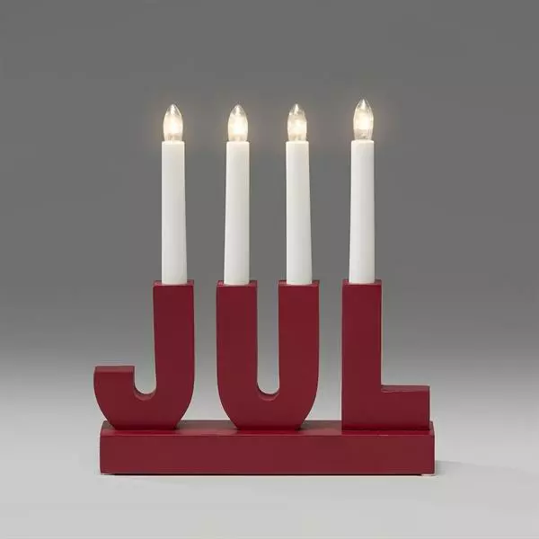 Dekorativ julestage der er rødmalet og fremstillet i træ, med 4 lys. Pærene er udskiftelige.Â