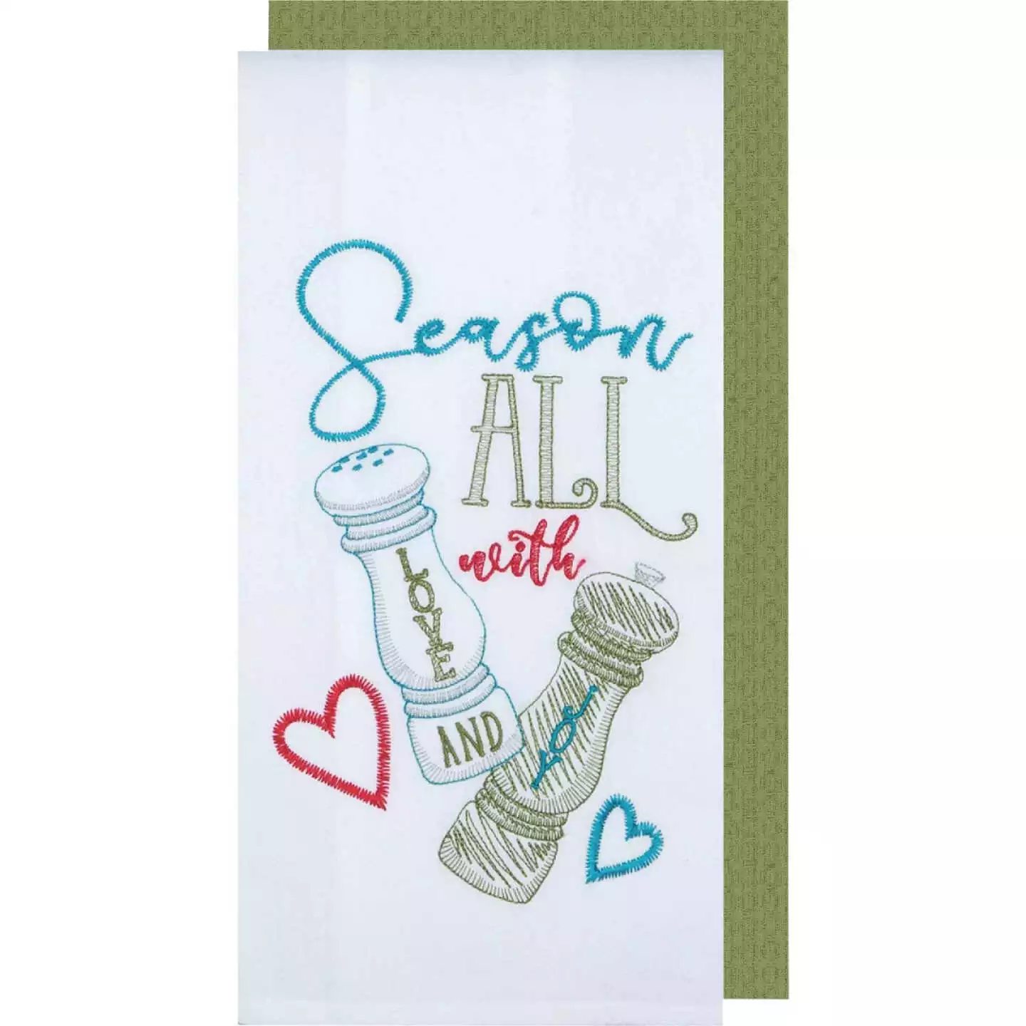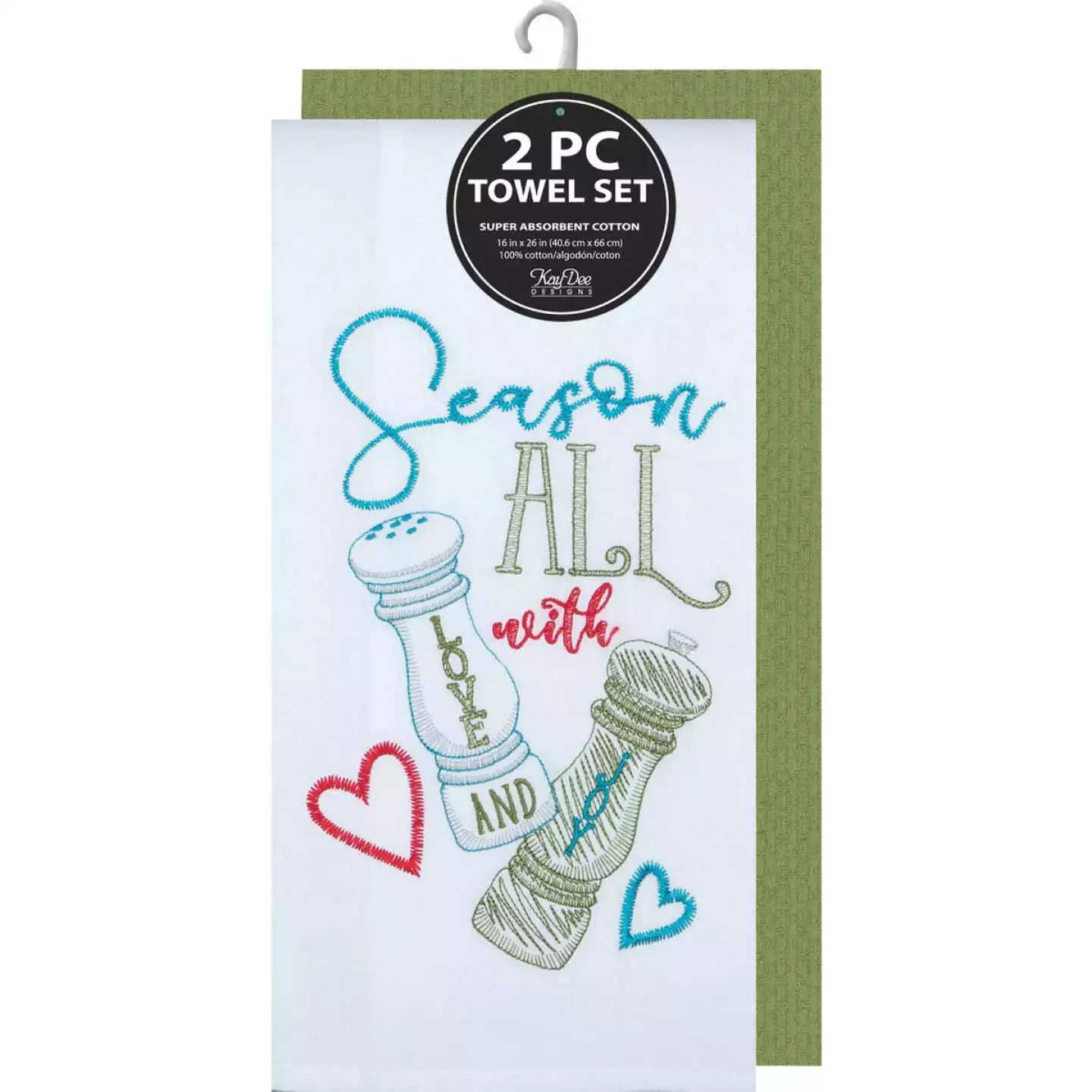 Durable embroidered kitchen towel is 100 % cotton.