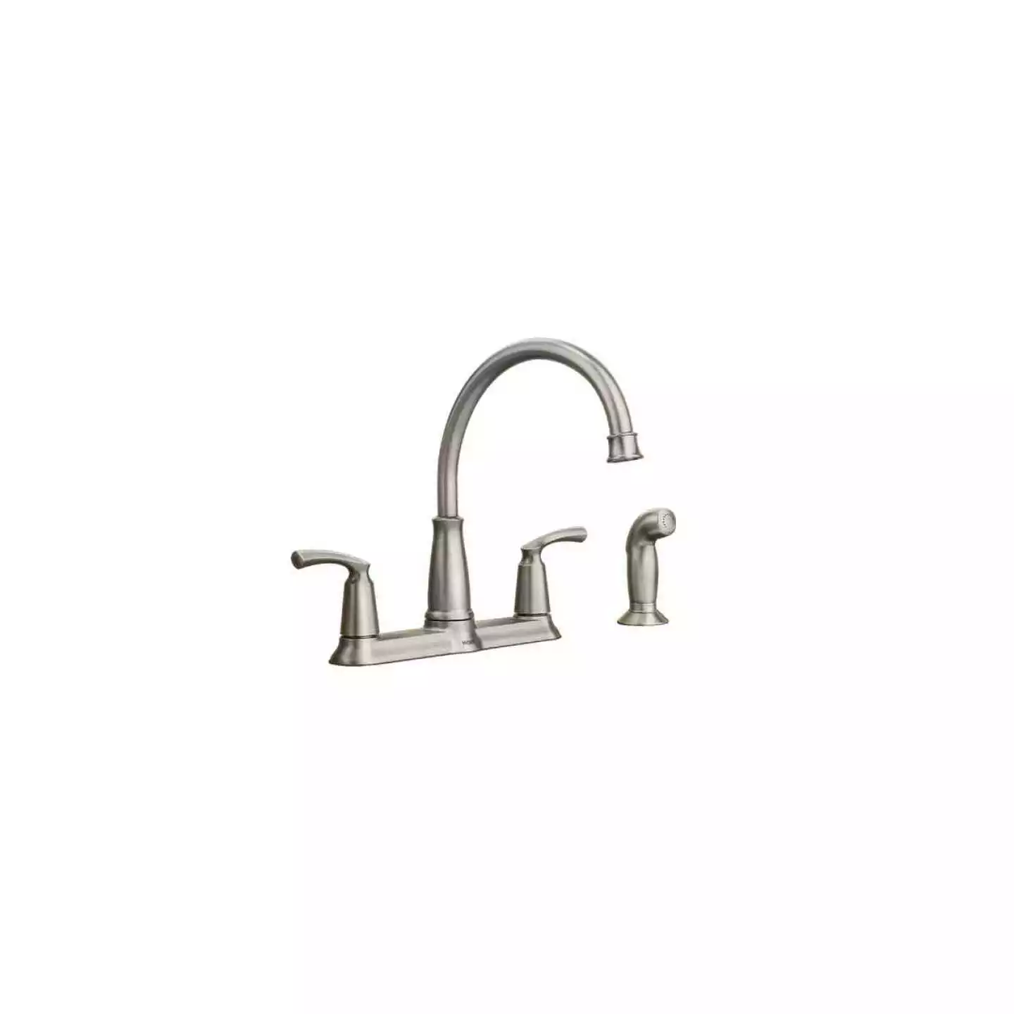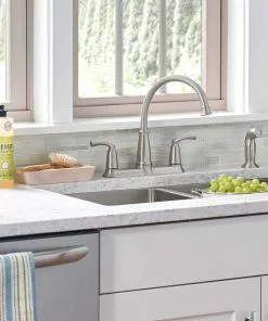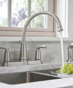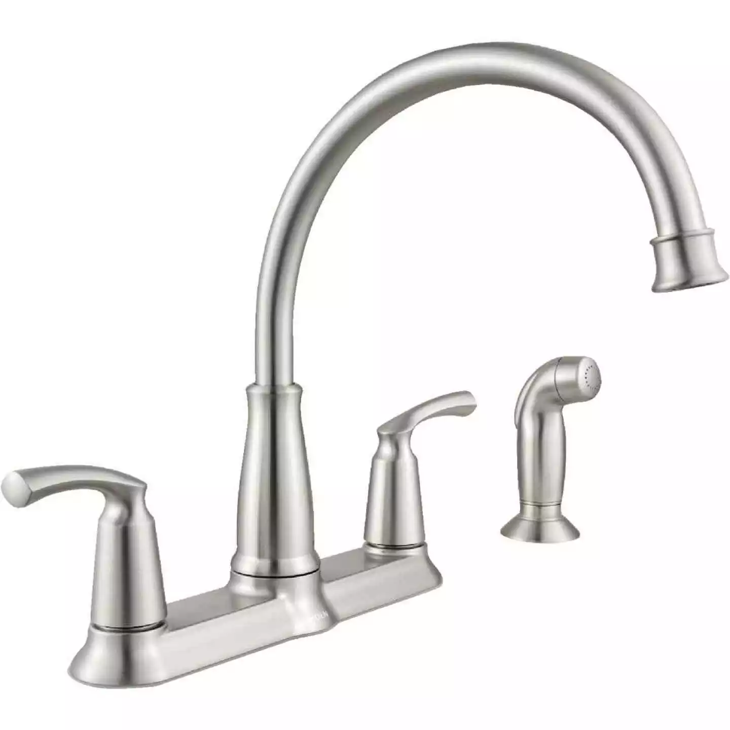 Double handle high arc kitchen faucet. Features Duralock quick connect system for easy installation and powerful rinse for heavy-duty cleaning. Standard design mounts on the sink or countertop. 2-handle levers make it easy to adjust water, side spray hose provides convenient and flexible cleaning at the sink.