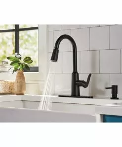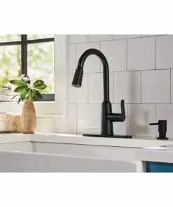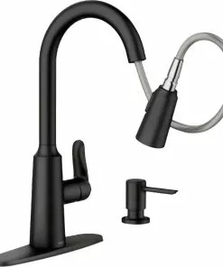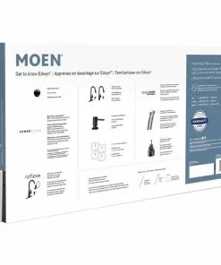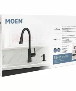 Combining modern functionality with ageless style, the Edwyn pulldown kitchen faucet adds a perfectly balanced look to any kitchen. The faucet features Moens Power Clean technology, which cleans 50% faster than Moen faucets without the technology, as well as the Reflex system to ensure smooth operation and secure docking of the spray wand. It can be mounted with or without a deck plate to accommodate one-, two-, three-, or four-hole installation. This faucet includes a matching soap dispenser to complete the look. Available in a Matte Black finish that adds contrast and striking design to the kitchen sink. Faucet pulldown hose offers flexible water delivery and hose retracts with ease. Features Duralock quick connect system for easy installation. Lever handle makes it easy to adjust the water. Soap/lotion dispenser included. Standard design mounts on the sink or countertop. Complies with Americans with Disabilities Act (ADA) specifications.