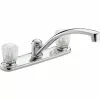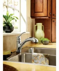 Renzo single handle kitchen faucet with pull-out spray. Push-button wand alternates water flow between aerated stream and forceful spray. 6-3/4″ spout with 7.5″ reach and 145 deg. swing reaches entire sink. 1.5 GPM (gallons per minute) flow rate, at 80 psi (pounds per square inch). Solid brass construction, brass waterways, and washerless cartridge. Integral vacuum breaker. 1 or 3-hole application. 8″ centers, 1/2″ I.P.S. connectors. CSA (Canadian Standards Association), NSF (National Sanitation Foundation), and ADA (Americans with Disabilities Act ) certified. For replacement, cartridge see Model No 1255 (SKU 464438). Lifetime limited warranty. The Renzopullout faucet simplifies life in the kitchen with a touch of a button. Seamless design and attractive styling makes Renzo a perfect complement to any kitchen decor.