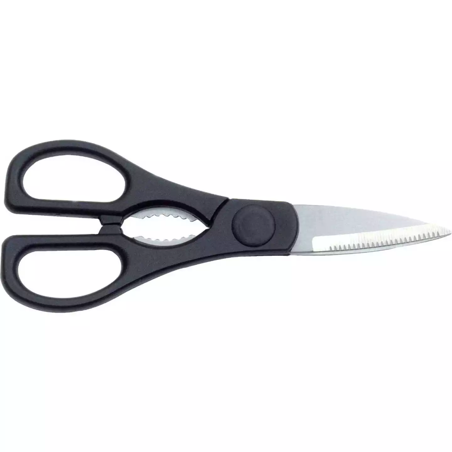 All-purpose kitchen scissor with heavy-duty stainless steel blades. Designed for strength and has the sharpness of a knife. Tool in handle for nut cracking and opening bottles. Black.