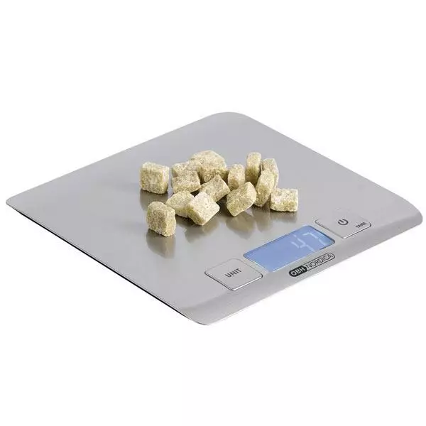 Køkkenvægt med platform i rustfrit stål, der har belægning mod fingeraftryk. Den kan veje op til 5 kg. og vejer i 1 grams interval. Slukker automatisk efter 60 sek.