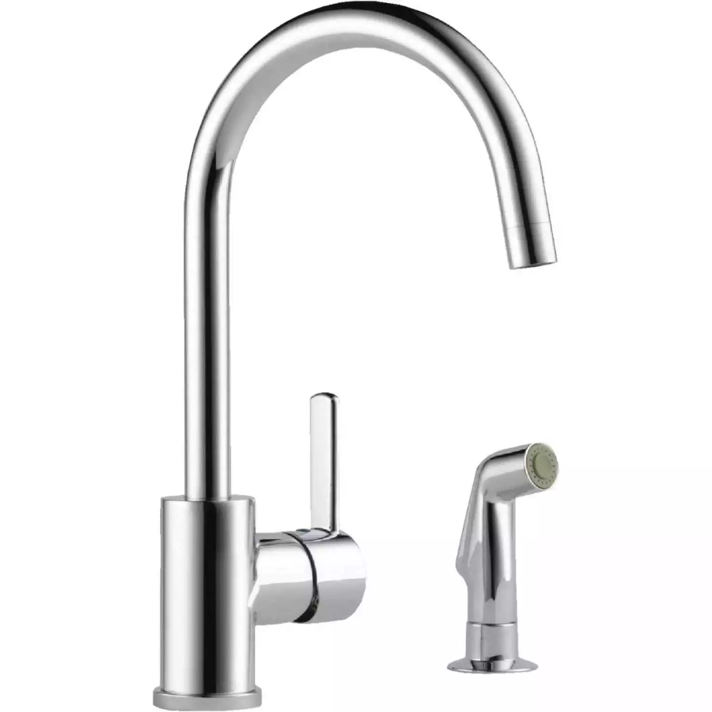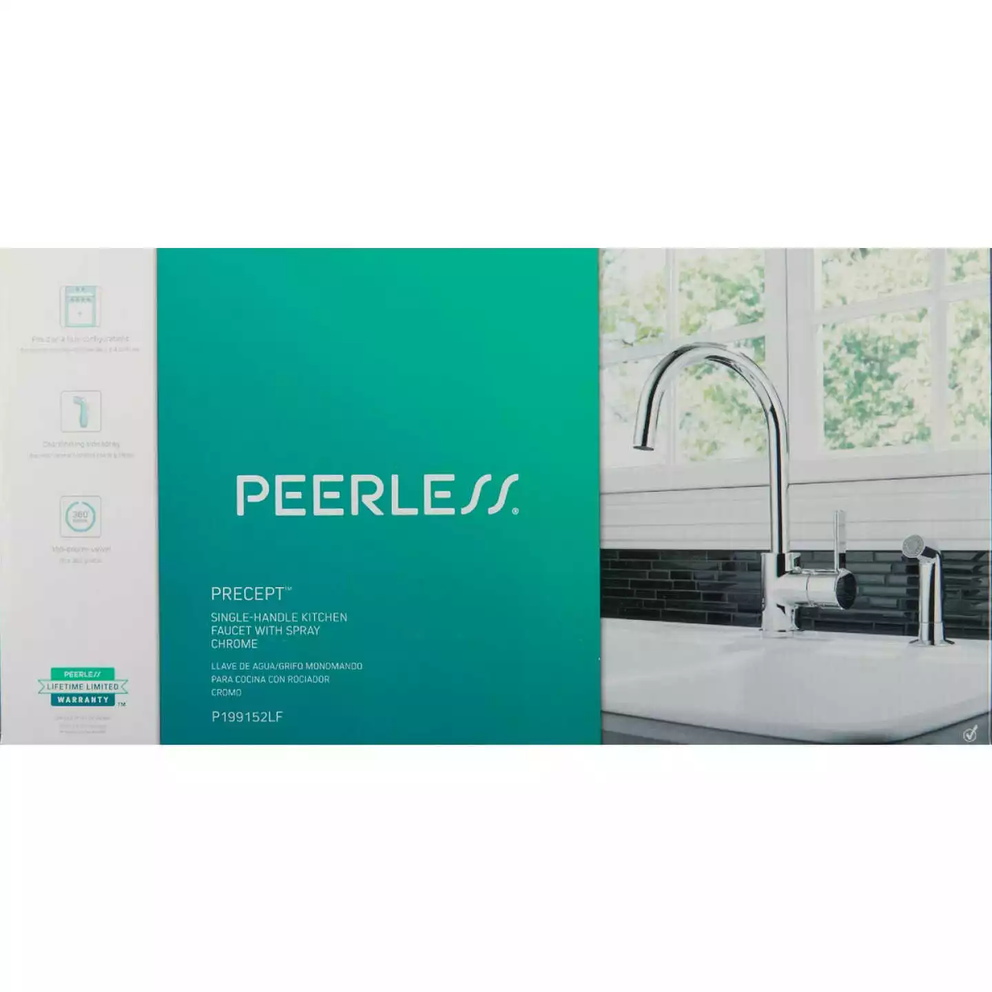 Peerless chrome single handle kitchen faucet with matching sprayer. Water Efficient – CalGreen Standards.