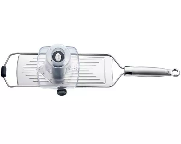 RÃSLE mandolinjern har et ekstremt skarpt V-formet skær, der nemt skærer selv tomater helt præcist og ensartet.⢠5 forskellige tykkelser op til 5 mm⢠Skridsikker silikone sørger for at mandolinjernet står stabilt, uanset vinklen du holder det i⢠Le