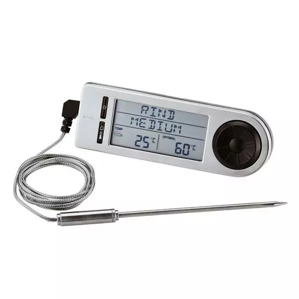 Stegetermometer med digitalt display til at bestemme den ideelle temperatur i fem forskellige slags kød. En anden sensor måler grill- eller ovntemperaturen. â¢Â Måler fra -20 °C to +250 °Câ¢Â Vælg mellem følgende sprog: tysk, engelsk eller fransk. â