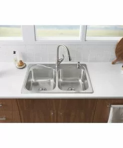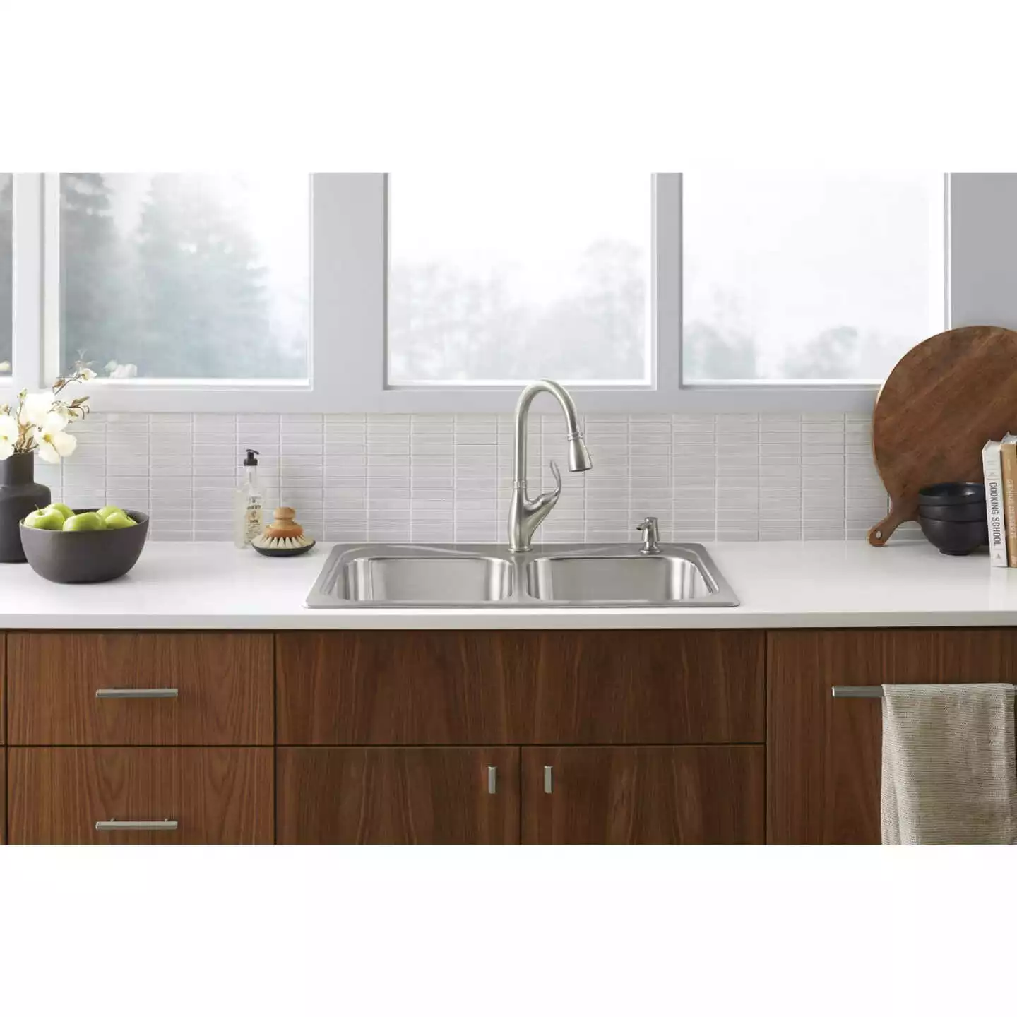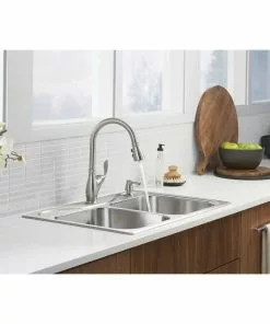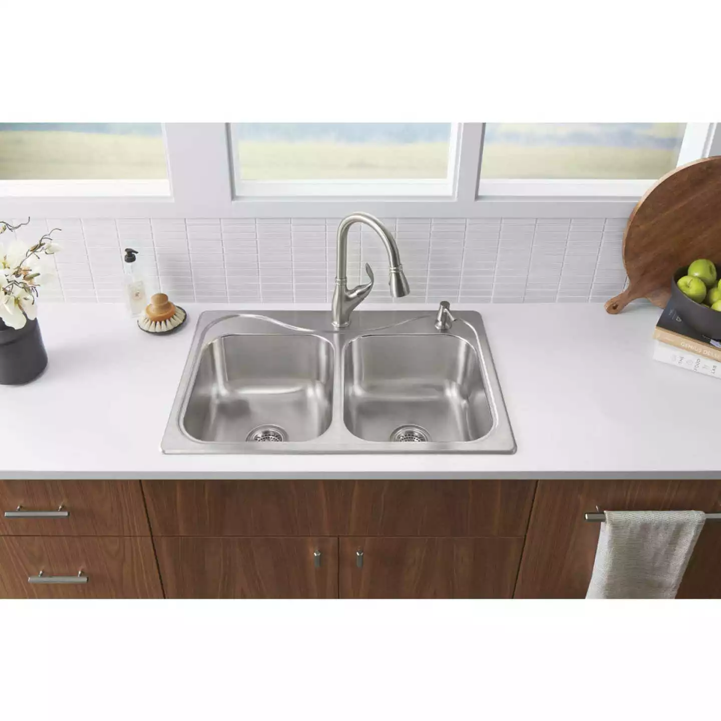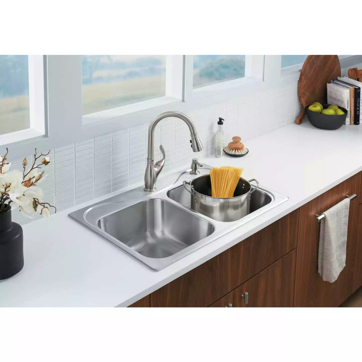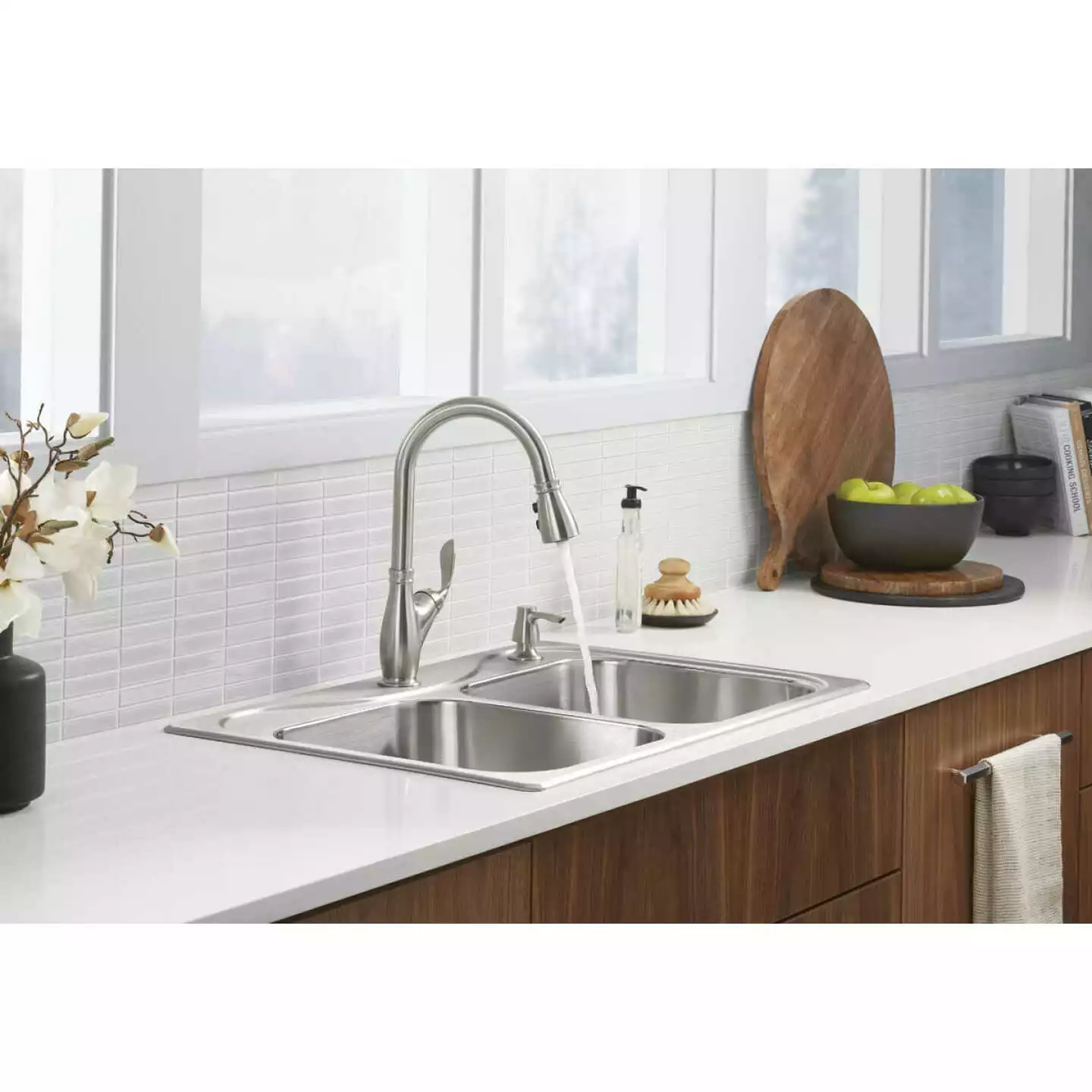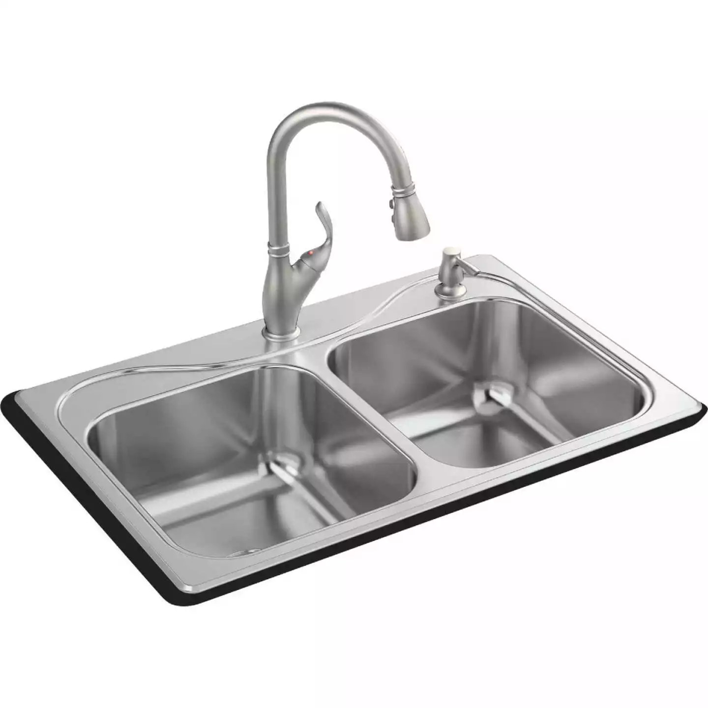 - Includes sink, assembled Vibrant Stainless pull-down facuet, soap/lotion dispenser, supply lines, drains and strainers, and installation hardware