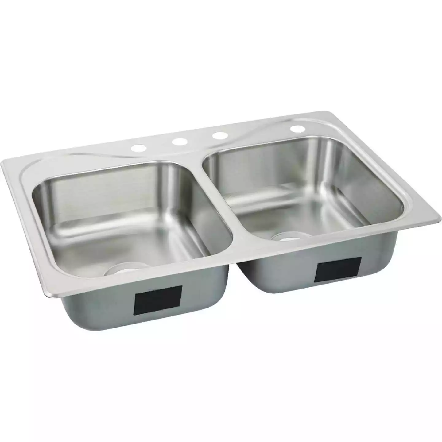 Southhaven double bowl self-rimming kitchen sink. 33″ x 22″ x 7″ double (equal) compartment curved deck design with 3-5/8″ drain opening. 21-gauge stainless steel with a self-rimming rolled rim. SilentShield sound deadening. Satin deck and basin. 4-hole faucet punching. Includes 10 installation clips. Lifetime limited warranty.