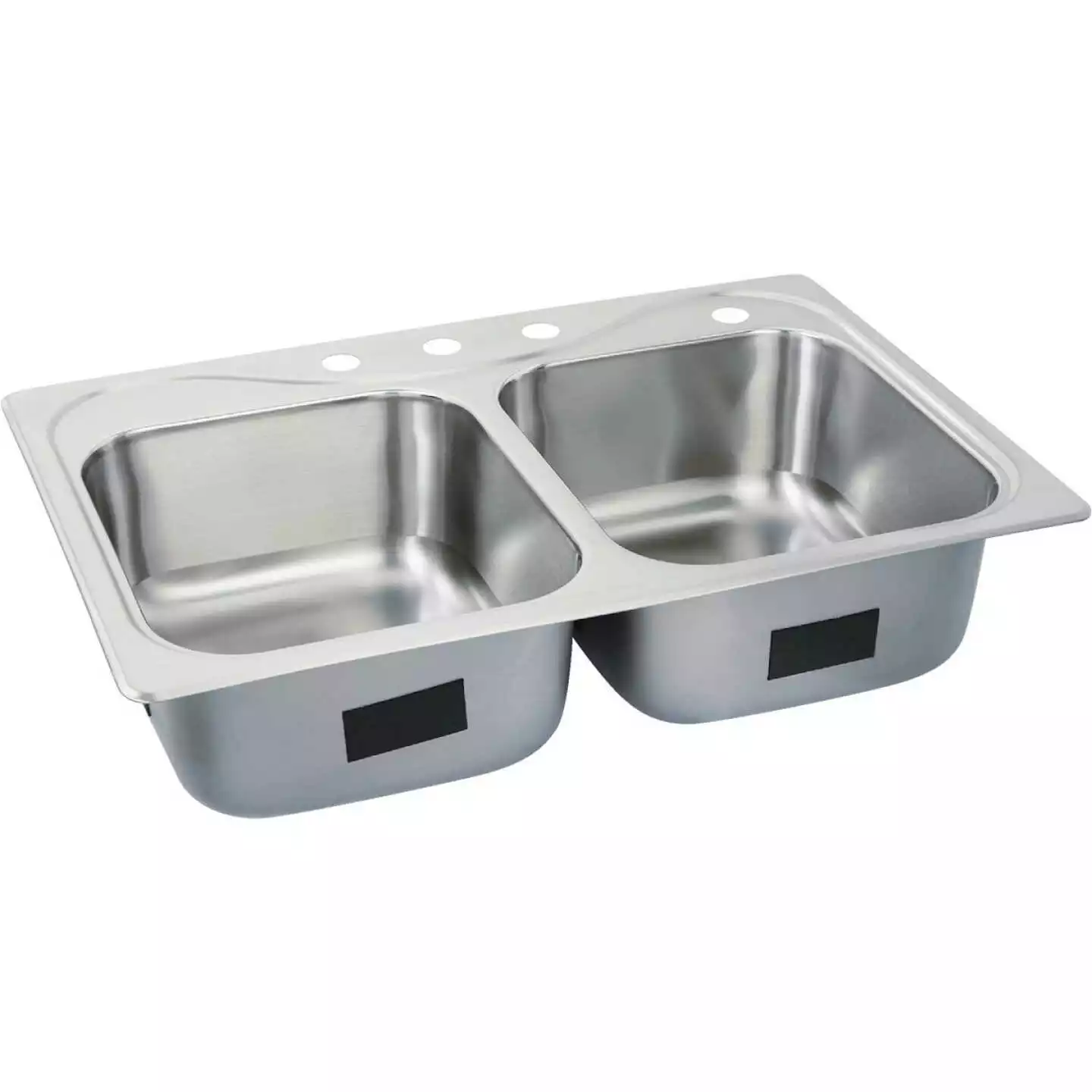 Southhaven double bowl self-rimming kitchen sink. 33″ x 22″ x 8″ double (equal) compartment curved deck design with 3-5/8″ drain opening. 20-gauge stainless steel with a self-rimming rolled rim. SilentShield sound deadening. Satin deck and basin. 4-hole faucet punching. includes 10 installation clips. Lifetime limited warranty.