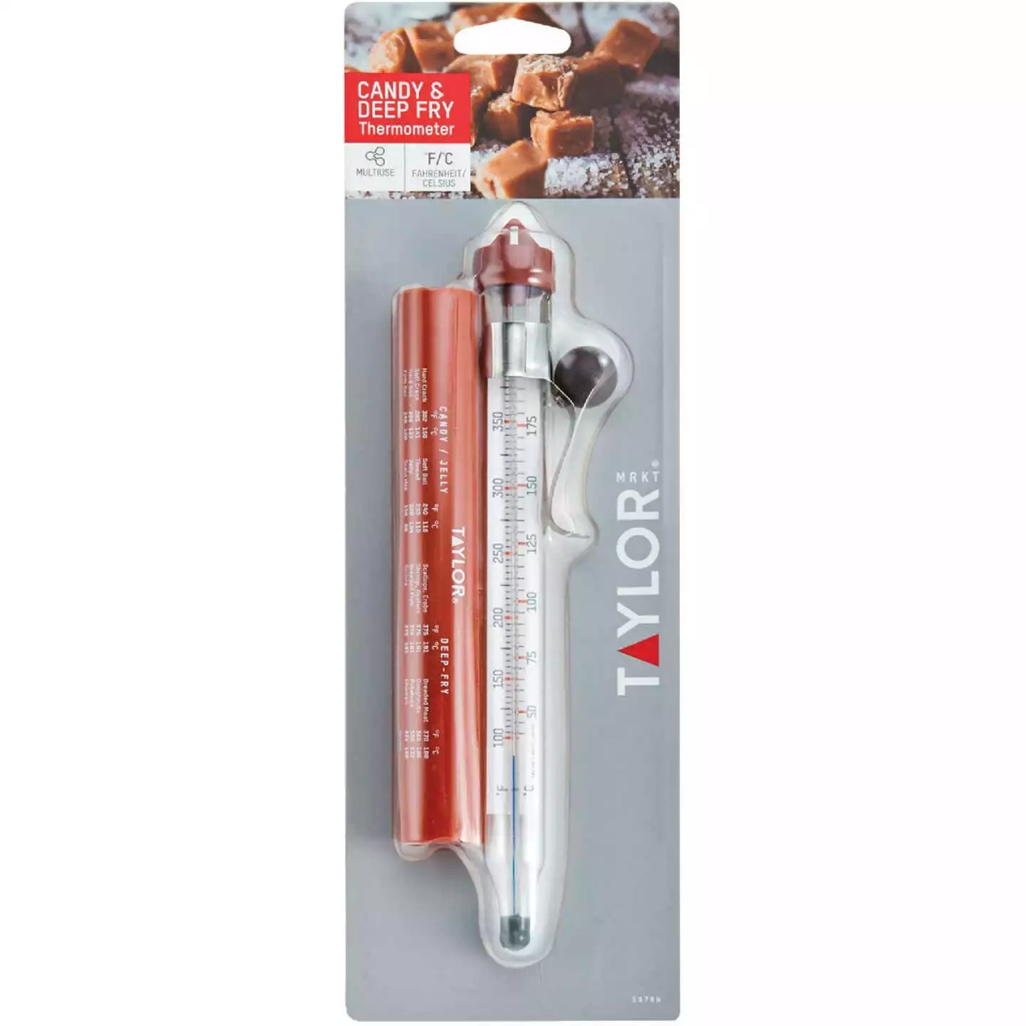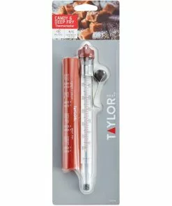 Easy-to-read face. Temperature range 100 deg (degrees) F (Fahrenheit) to 400 deg F. Glass tube with adjustable pan clip. 8″ long. Protective storage sleeve is printed with convenient cooking chart. Nonmercury filled tube.