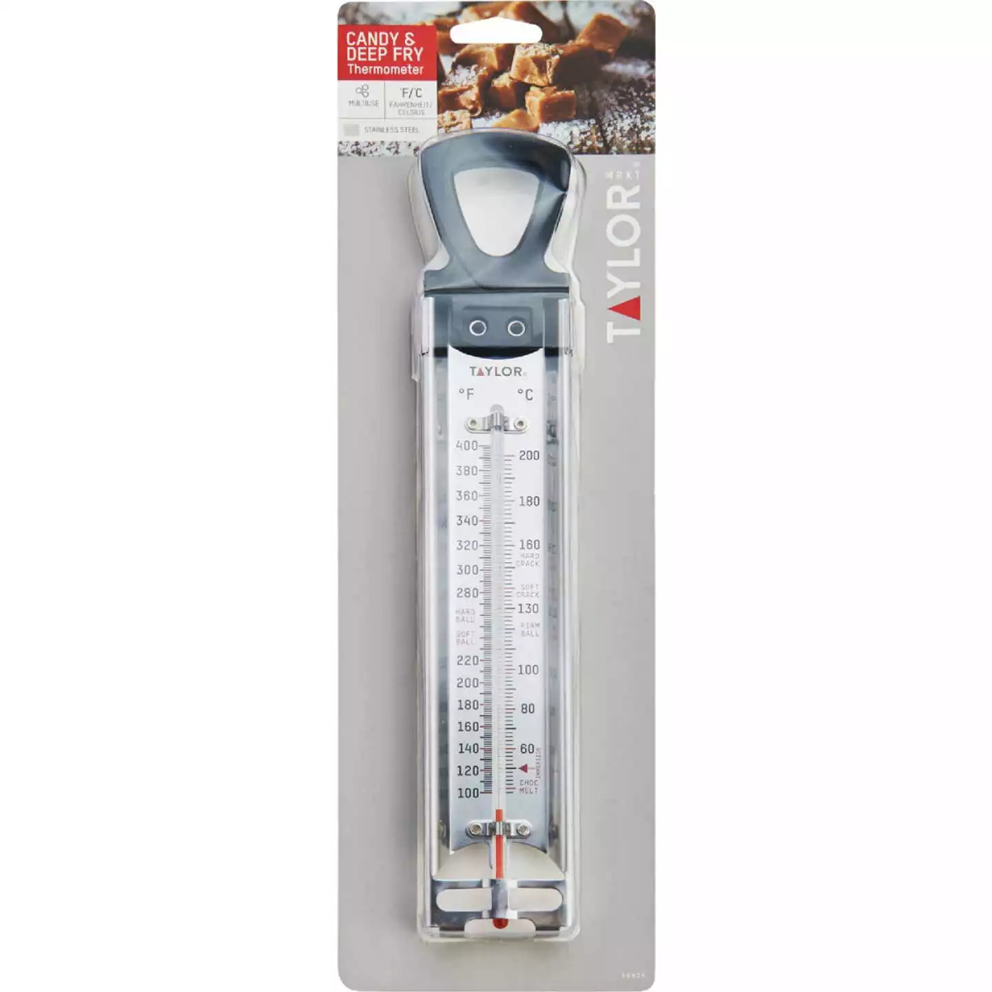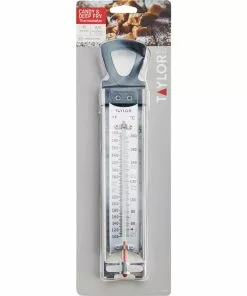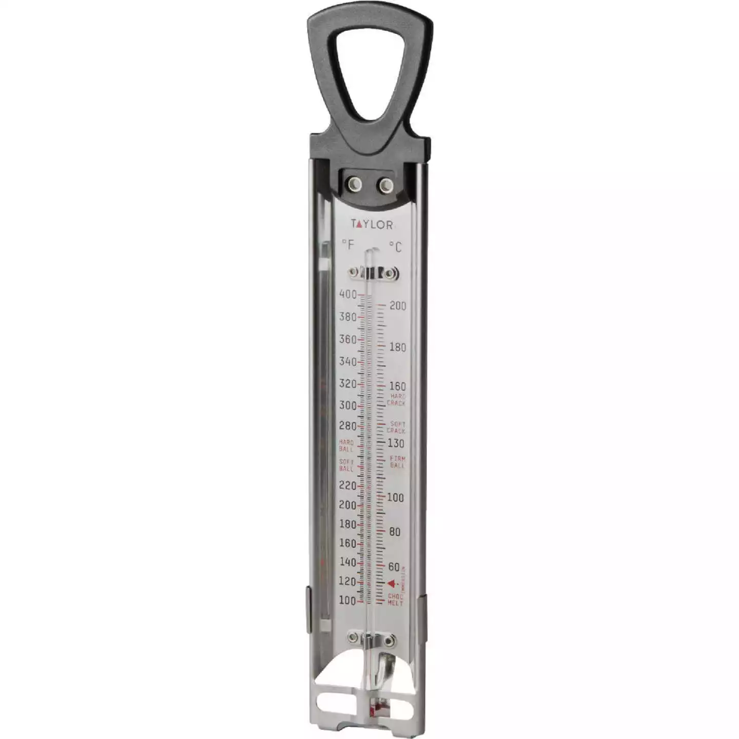 Large, easy-to-read temperature zones. Insulated handle with built-in pan clip. Temperature range 100 to 400 Deg. F. (-50 to 200 Deg. C.). Durable stainless steel. 12 In. L.