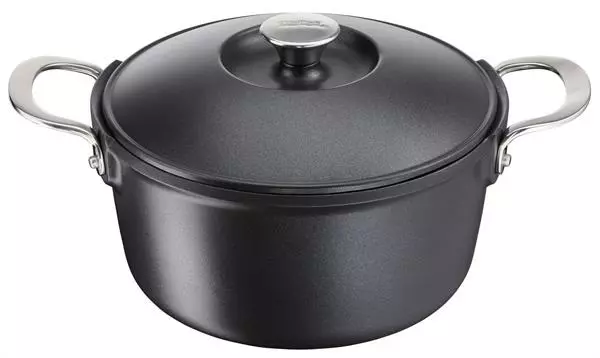 Tefal Aroma Gryde/Stegeso. Den er fremstillet i støbt aluminium, belagt med titanium og med håndtag i rustfrit stål. Den tåler temperaturer op til 250 grader, hvilket gør den kan gå i ovnen. Kan anvendes på alle typer komfurer, inkl. induktion. Gryden