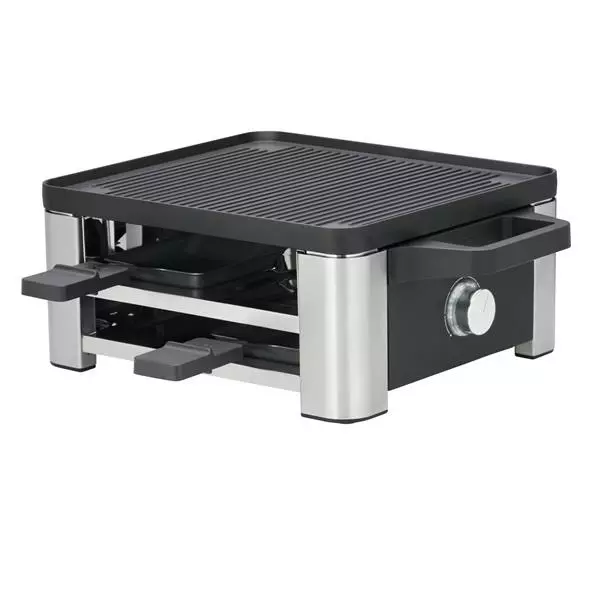 WMF – Lono – Raclette for 4Kabinet af Cromargan® i høj kvalitet.Variabel temperaturindstilling med LED-belysning.Vendbar støbt plade med non-stick-belægning samt flad og ribbet overflade, som sikrer en sund grilning af kød, fisk og grøntsager. Kan tåle o